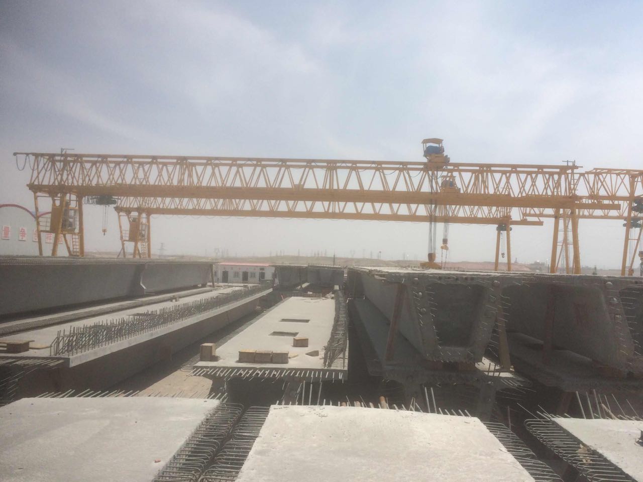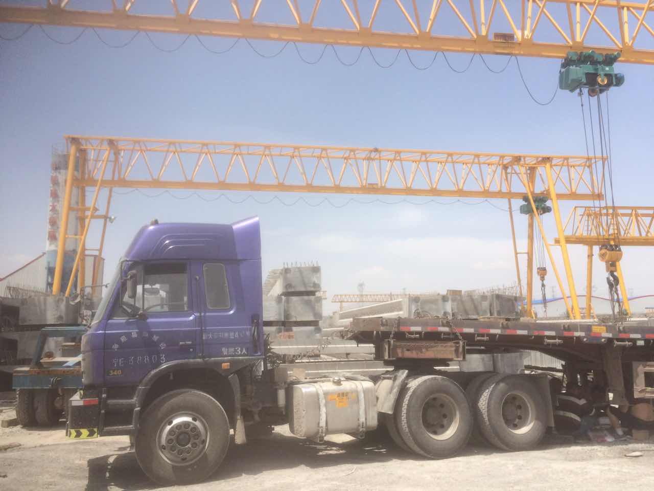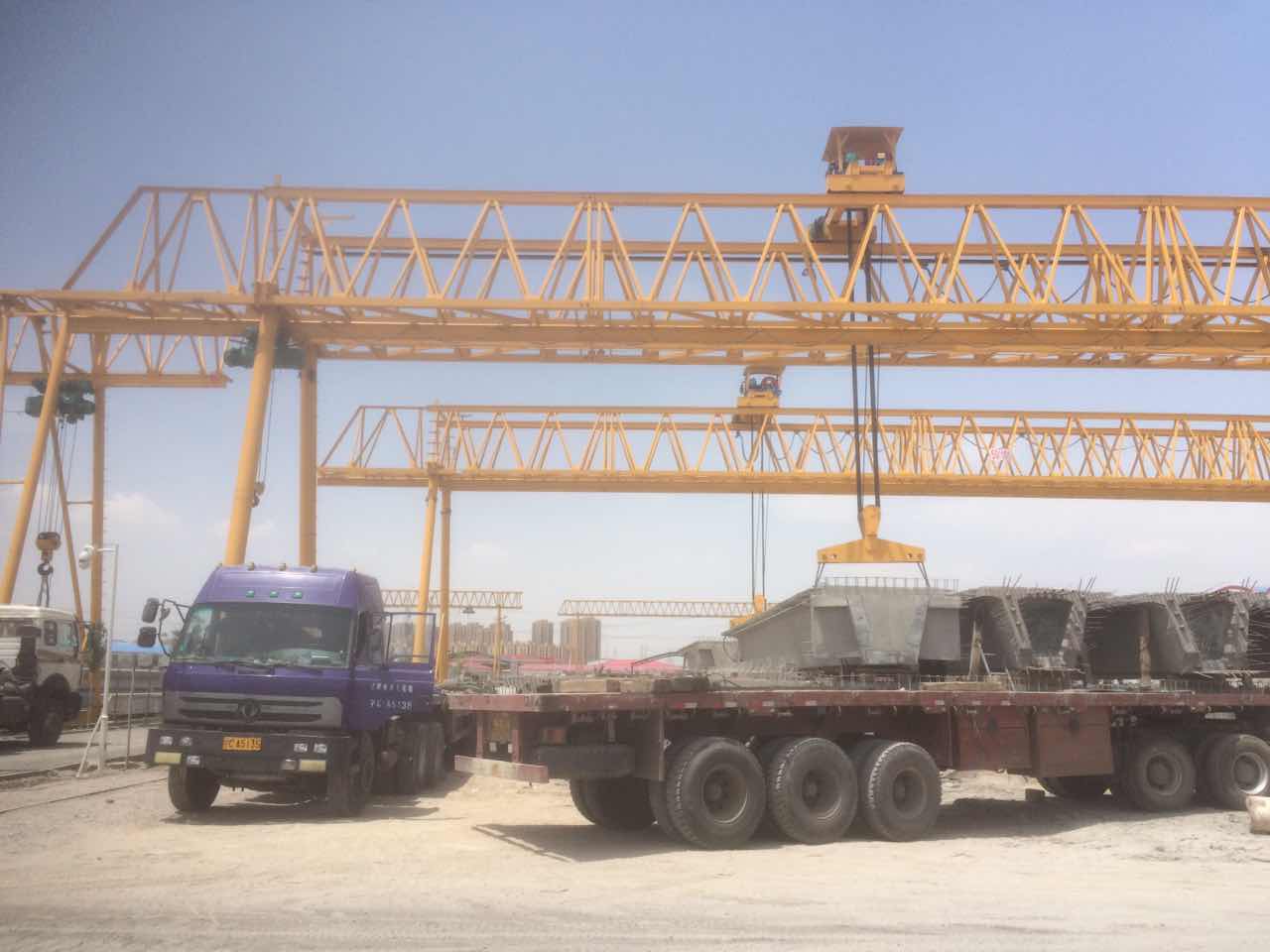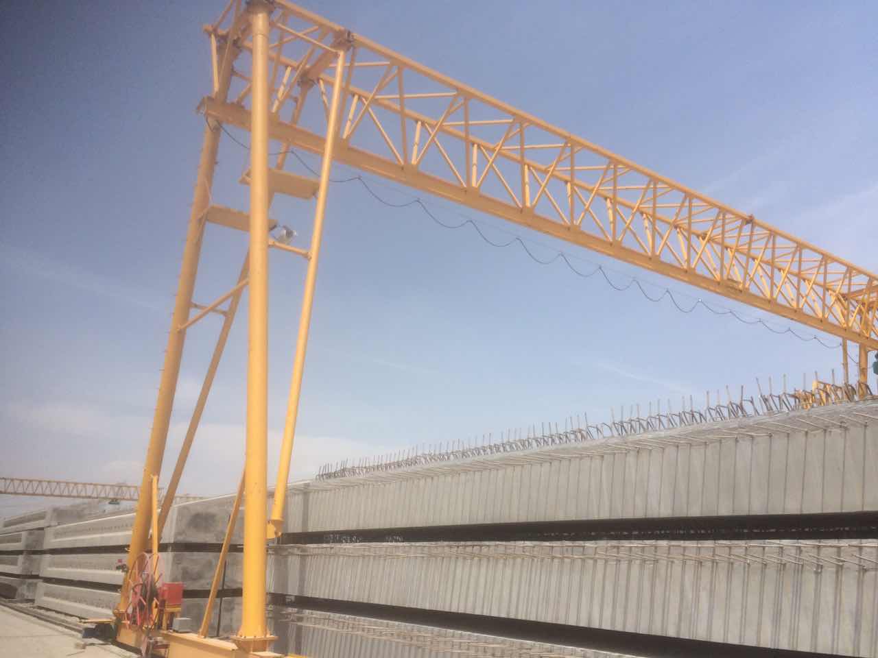 我公司生產(chǎn)的路橋提梁門式起重機在用戶使用現(xiàn)場進行生產(chǎn)作業(yè)。此產(chǎn)品行走機構采用均衡裝置,保證了走行輪組各輪受力均勻。在雙機吊運砼箱梁時采用雙機同步運行要求?,F(xiàn)得到了用戶的好評!